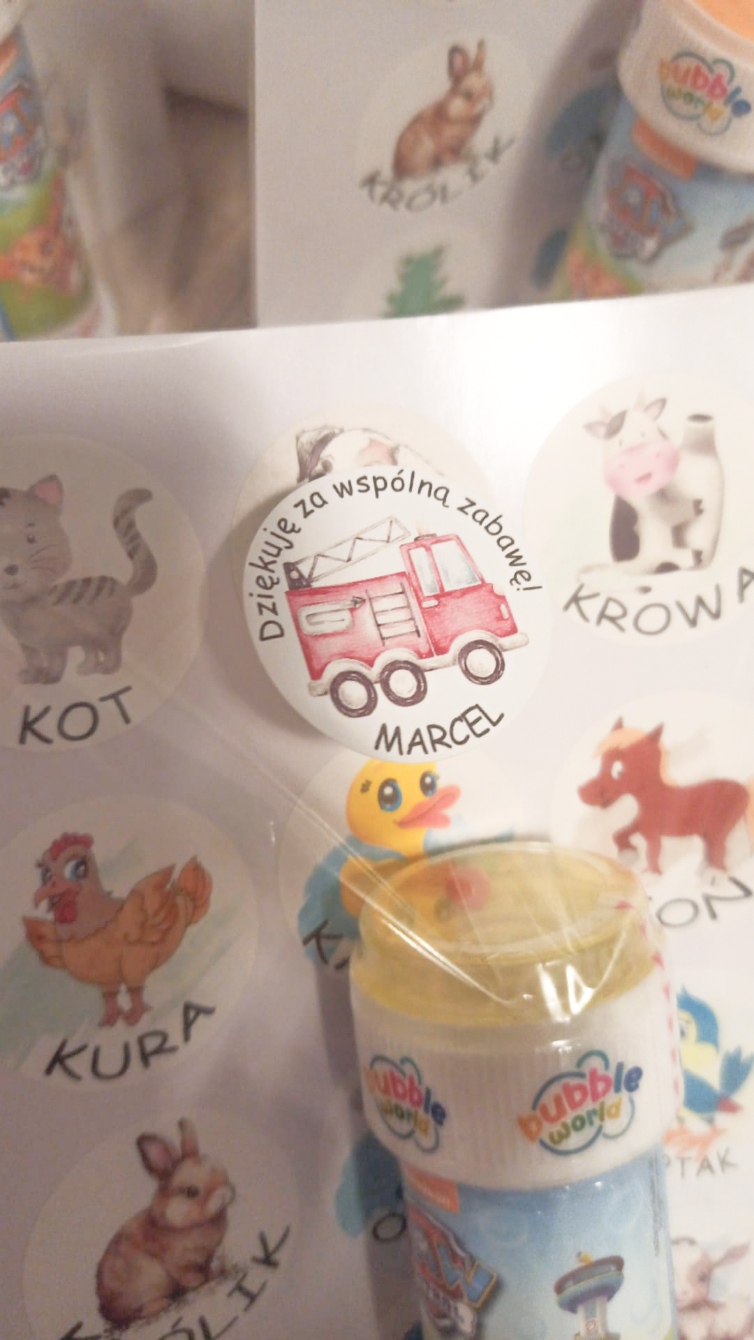 Okrągłe personalizowane naklejki z podziękowaniem za wspólną zabawę do żłobka lub przedszkola z imieniem Twojego dziecka to świetny pomysł na prezent dla innych dzieci.